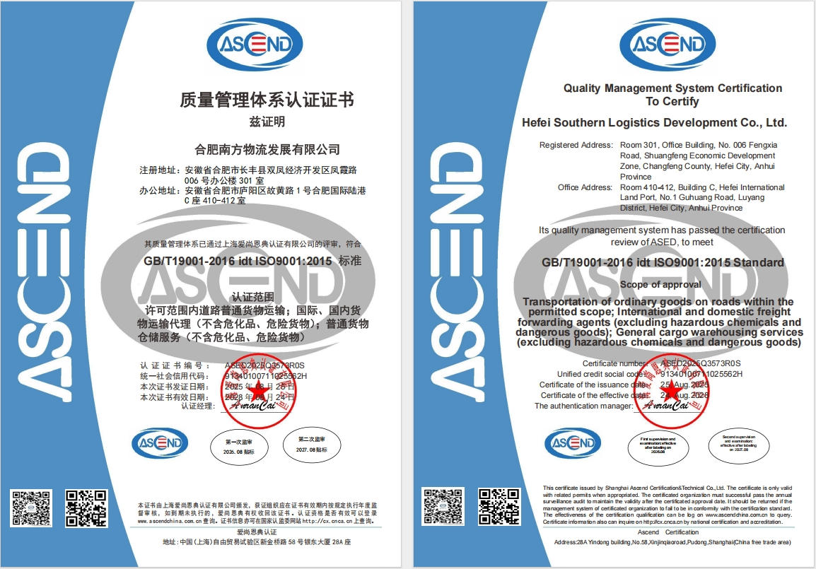 值得一提的是,自2024年11月底,合肥南方物流公司完成重组后,迅速步入发展快车道。在不到一年的时间内,合肥南方物流公司先后取得了道路运输经营许可证、国际货运代理资质和无船承运人(NVOCC)资质等经营许可。道路运输经营许可证,夯实了合肥南方物流国内陆运业务的合法性与专业性基础。国际货运代理资质和无船承运人(NVOCC)资质的成功获取,为合肥南方物流拓展国际物流市场、提供跨境综合解决方案打开了通道,实现了从国内运输向国际物流服务的有效延伸。此次荣获的ISO9001国际质量管理体系认证,是对合肥南方物流内部管理、操作流程、客户服务及持续改进能力的权威认可,标志着合肥南方物流已建立起一套科学、标准且高效的质量管理体系,为客户服务的稳定性和可靠性提供了坚实保障。